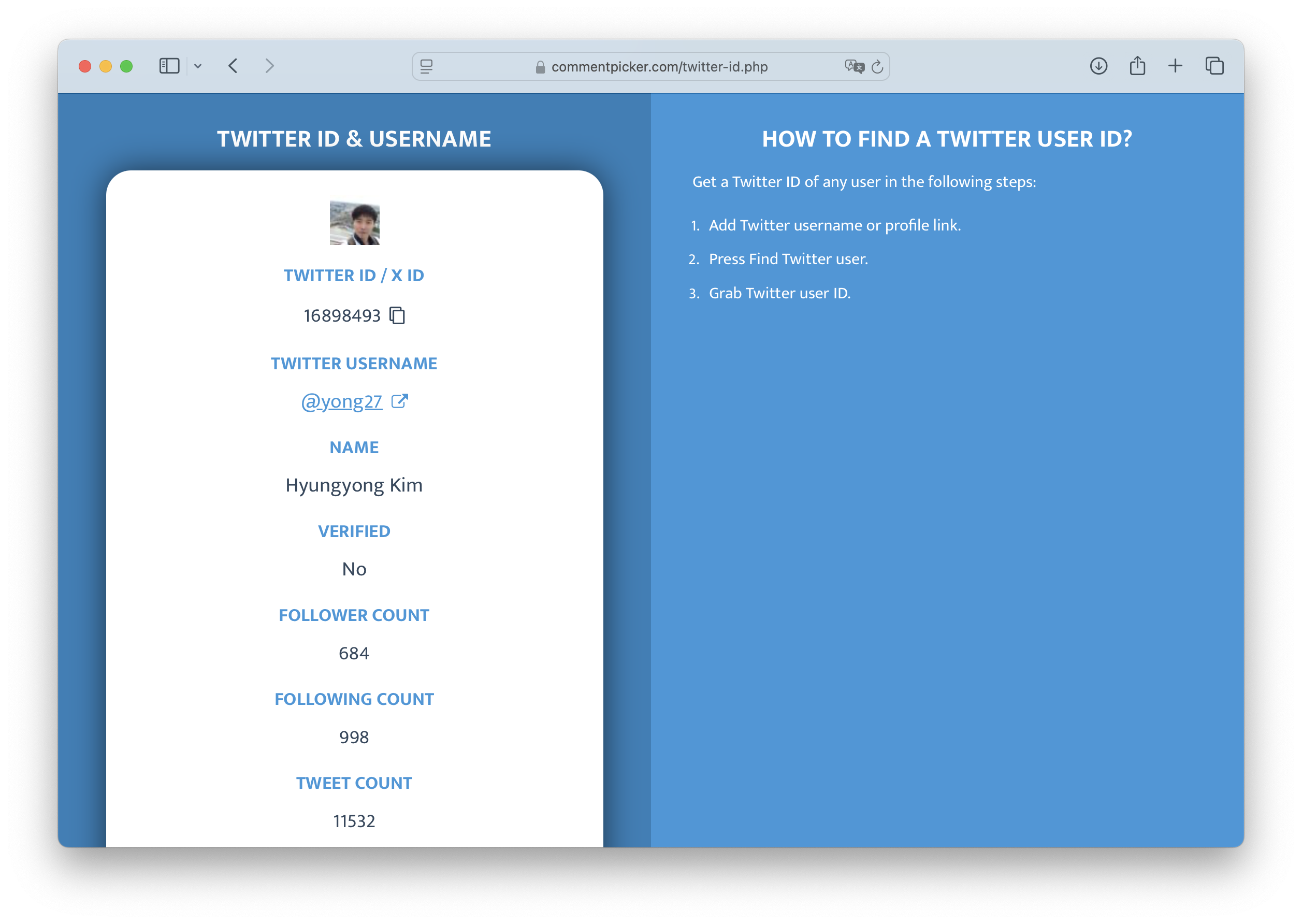 Free 사용자는 얼마나 쓸 수 있나 봤더니 한달에 100번 가져오고, 500번 쓸 수 있다고 한다. 엄청 짜다. 한달에 100번이라니! 어쩌면 테스트하느랴 써 본 것 때문에 이번달(30일) 모자를지도 모르겠다. 게다가 페이지를 좀 더 내려보면, Free 사용자일 경우, 대부분이 "1 requests / 15 mins PER USER" 이다. 15분 당 요청 한번? 음냐; 암튼, 위에서 만든 Bearer Token 외에도 나의 X 사용자 id를 알아야 한다. 나는 @yong27을 쓰니, "yong27"이 id 인줄 알았는데, 아니다. 이건 username이고, 숫자로 된 별도의 ID가 필요하다. 이걸 알아내는 다양한 방법들이 있는데, 가장 간편한 방법인 FIND TWITTER ID 와 같은 사이트에 물어보는 것이다.