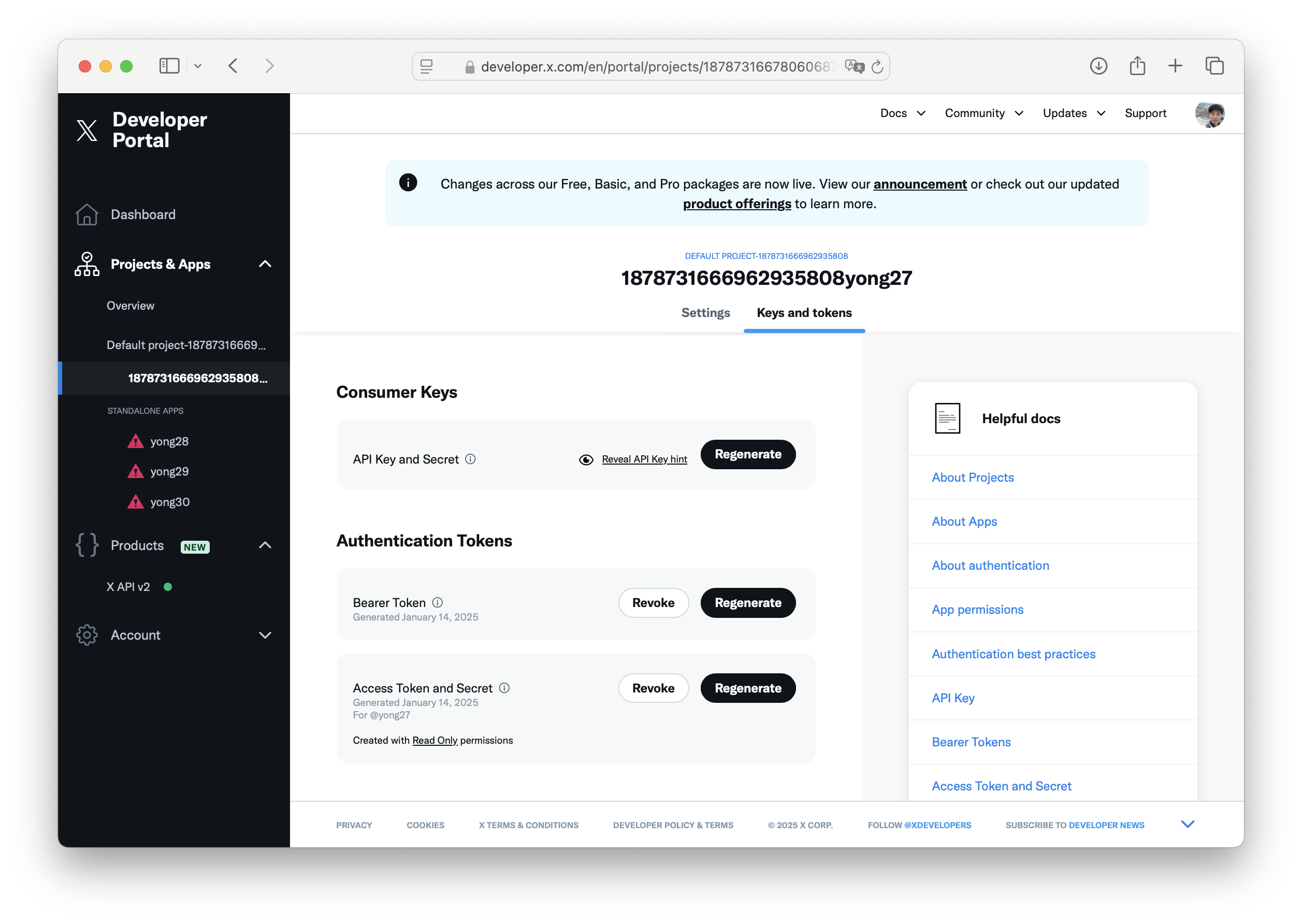 위 사이트에 들어가서 X 계정으로 로그인하고, "Developer portal"에 들어간다. Free 사용자로 이용할 수 있는 Default Project를 만들 수 있다. 만들어진 프로젝트의 "Keys and tokens"에 들어가면, "Bearer Token"을 만들 수 있다. 이 토큰은 X API를 쓸 수 있게 하는 토큰으로 API를 호출해 쓰려면, 호출한 자가 나라는 사용자를 확인하는 키다.