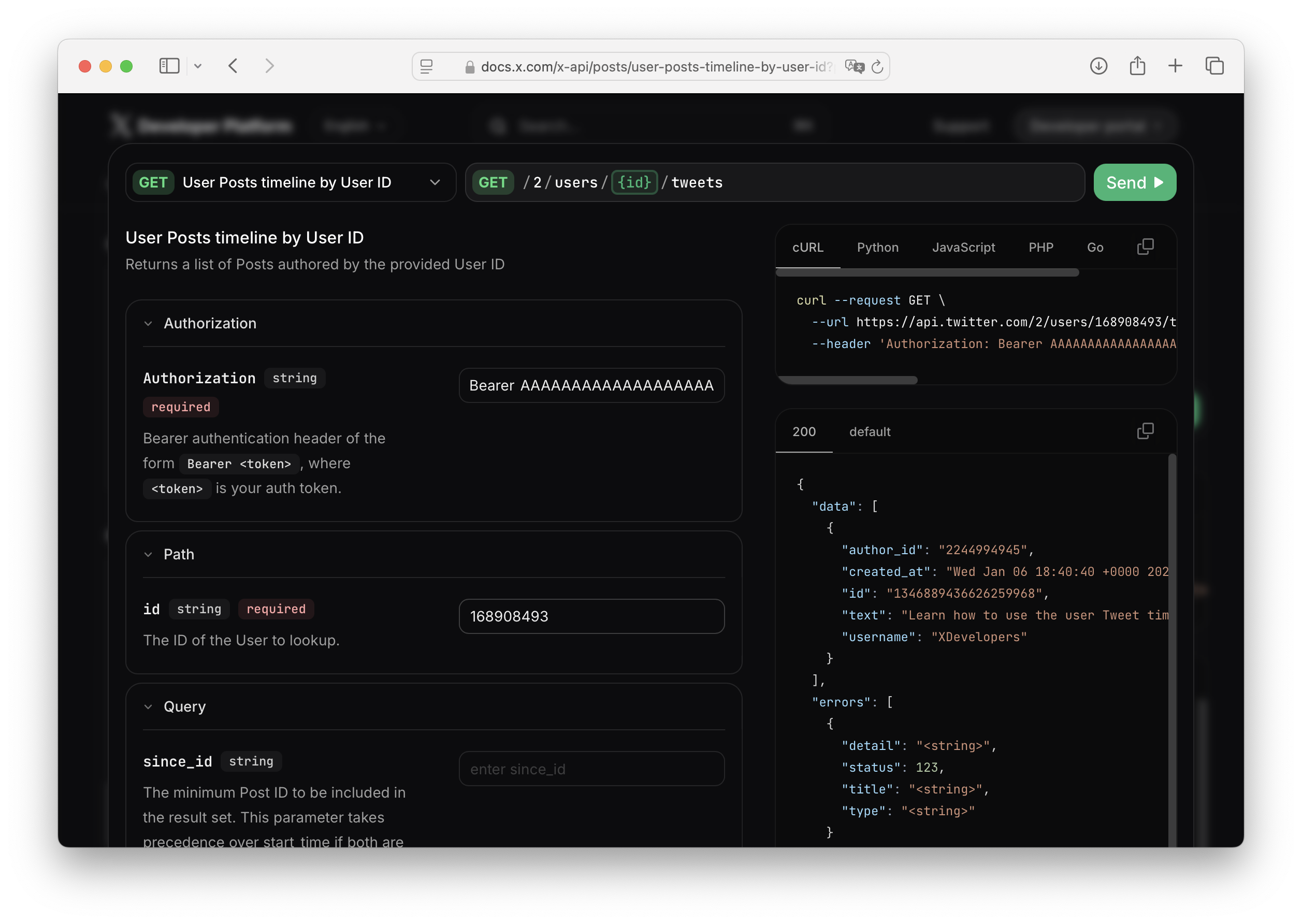 X API에는 다양한 endpoint가 제공되는데, 내가 필요한 것은 내가 쓴 트윗들을 가져오는 것이므로, "User Posts timeline by User ID" 를 이용한다. 편리하게도, 사용법을 설명하는 사이트에 바로 이를 시도해 볼 수 있는 버튼 "Try it" 이 있다. 리눅스 명령행 curl 이나, postman 프로그램을 써보는 것보다 편리하게 연습해볼 수 있다.
