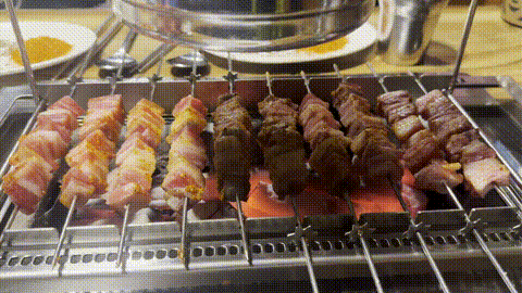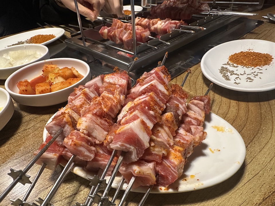이어서 양꼬치를 자동 익힘 기계에 올리고 기다린다. 쯔란에 찍어 먹을 걸 생각하니 벌써부터 침이 고인다. 고기를 기계에 올리고, 익기를 기다린다.