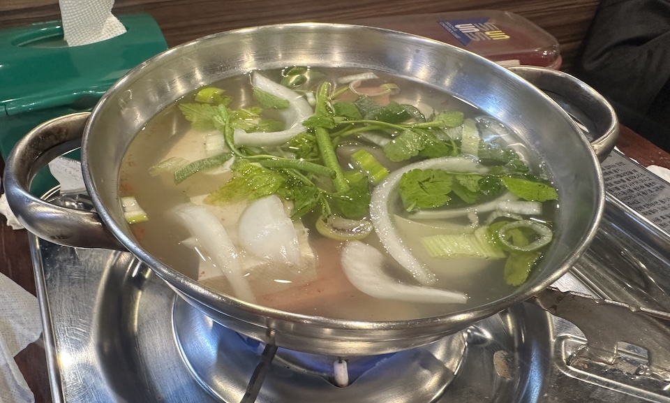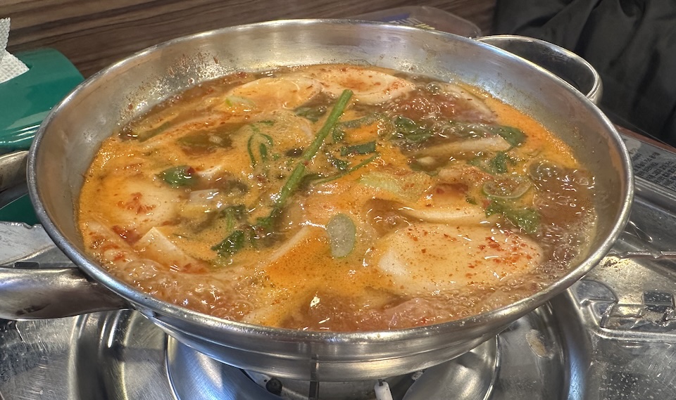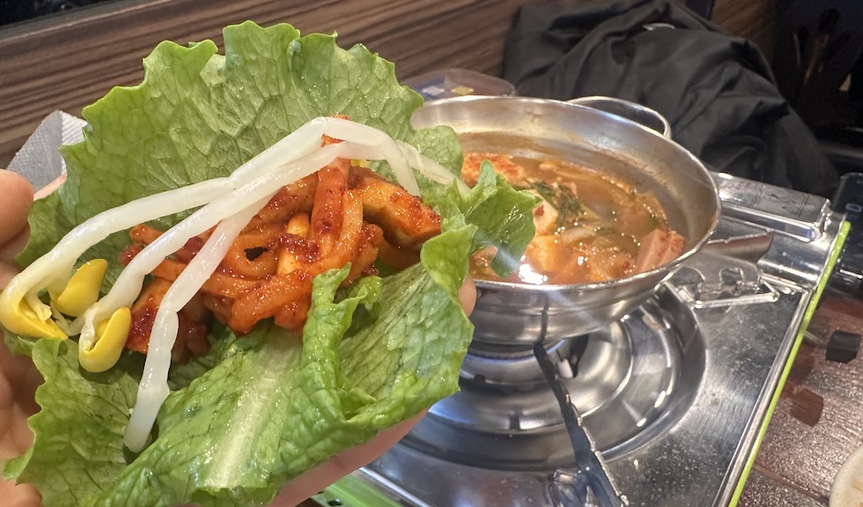 서너쌈 넘어가면서 서서히 매운 맛에 귀 앞에 땀이 차기 시작한다. 이때 즈음 섞어찌개가 끓는다. 국물 함 떠 먹어 본다.