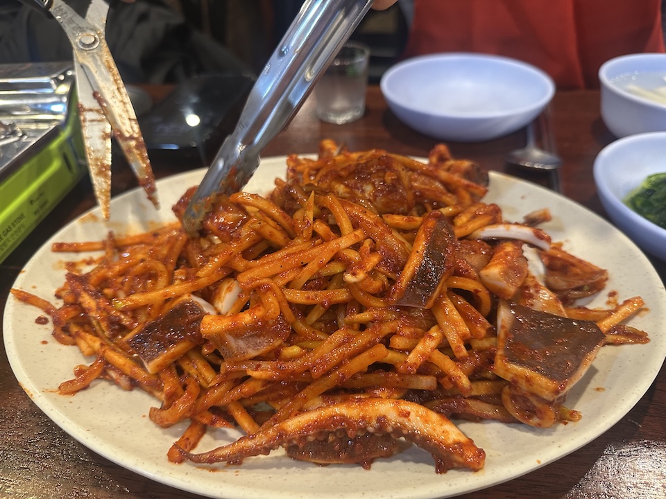 오징어보쌈의 오징어를 집게와 가위로 먹기 좋은 크기로 잘라준다. (아 이거 보니 또 매워진다)