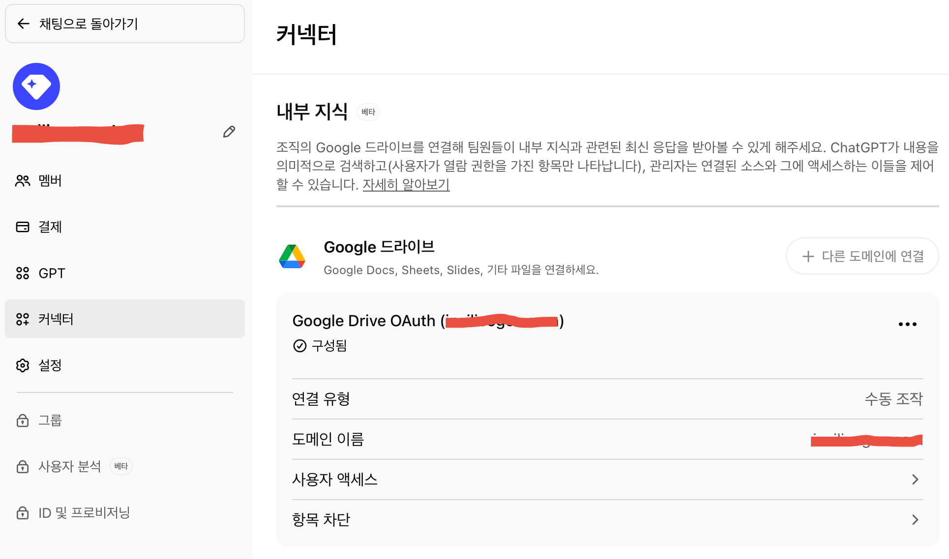 처음 "구글 드라이브" 연결을 한다고 하면, ChatGPT Team 계정과 같은 도메인 주소의 "구글 드라이브" 로그인 창이 나오고, "구글 드라이브"에서 "ChatGPT 커넥터"를 연결할지 물어본다. 연결한다고 하면, "내부지식 수집중" 이라는 메세지와 함께 준비가 되면 알려준다고 한다.