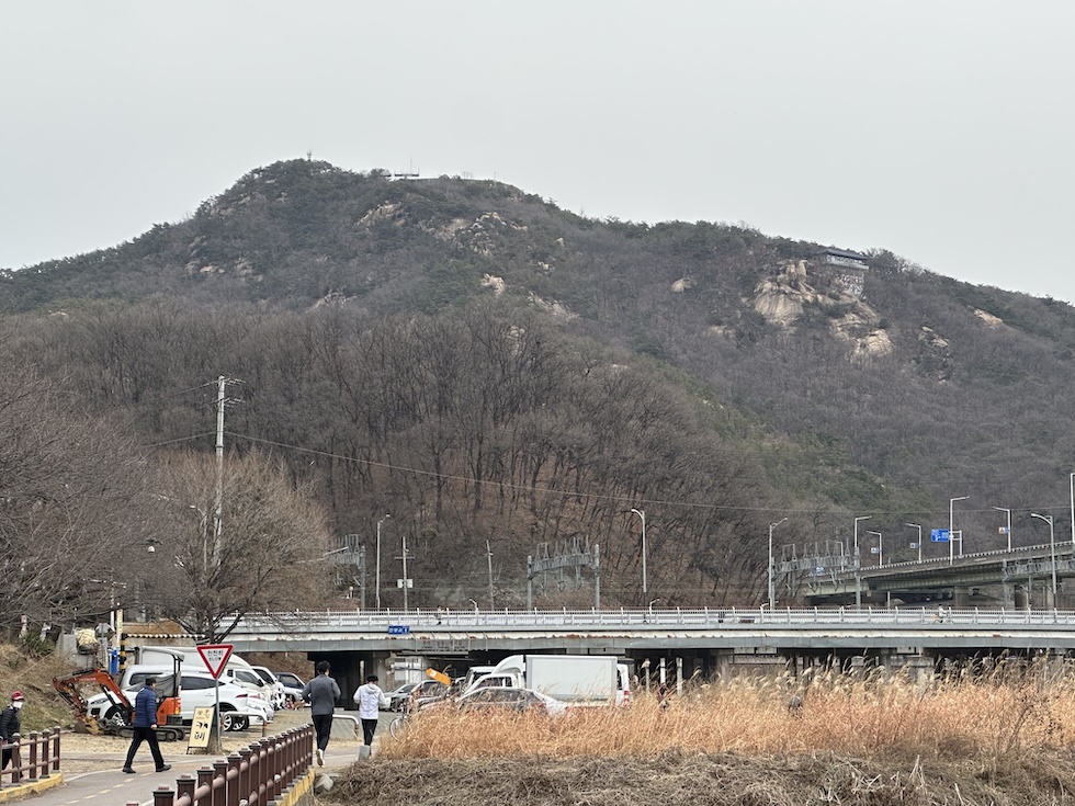 앞에 보이는 산 중턱에 보이는 기와 건물이 망해암이다. 자전거길을 지나 계속 가다보면, 경인교대가 나온다.