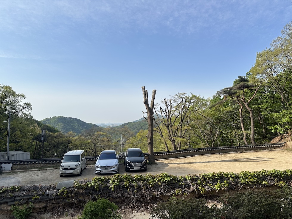 앞 주차장 넘어 풍경이 보이긴 하다. 기념 셀카도 한장 남기고.