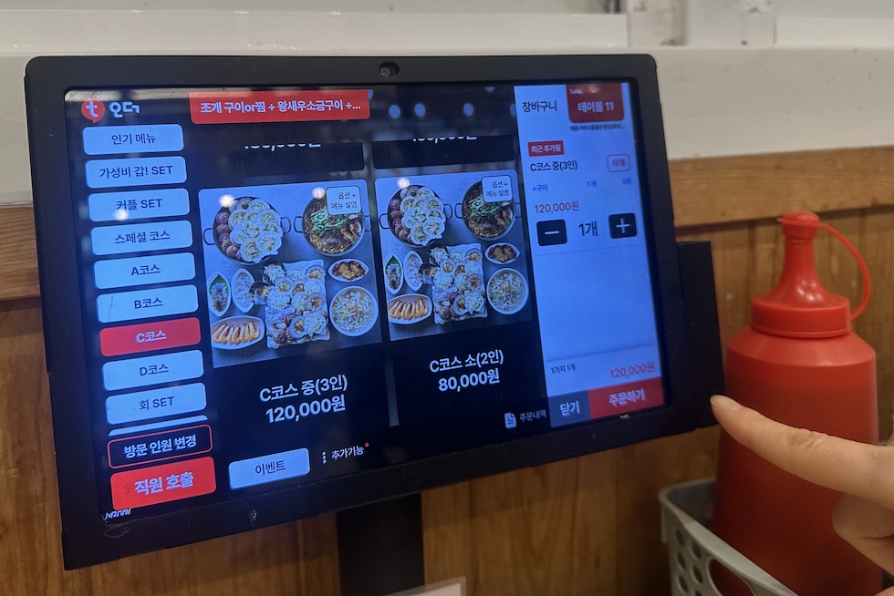 웨이팅이 끝나고 착석. 메뉴는 테블릿으로. 오랜만에 와서 그런가 꽤 비싸네. 그럼에도 가성비 높다 하니, 조개구이가 원래 비쌌던 건가 보네.