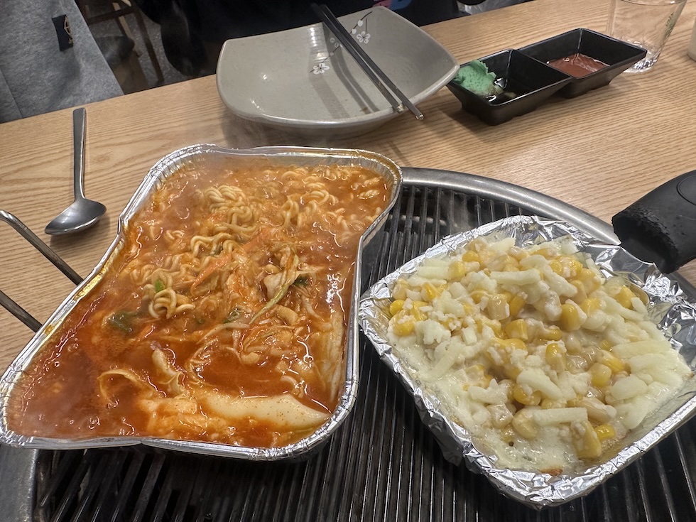 첫 음식이 나왔다. 치즈라면과 치즈콘~ 탄수화물 먼저 먹으면 안되는데?