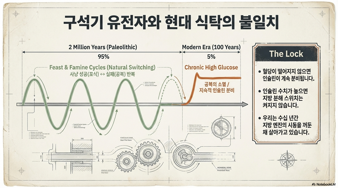 인류의 유전자는 약 200만 년에 걸친 수렵·채집 생활에 최적화되어 있다. 구석기시대 인류에게 두 대사 경로는 모두 생존에 필수적이었다. 사냥에 성공한 날에는 고기와 과일에서 얻은 포도당과 지방이 에너지원이 되었고, 먹을 것을 구하지 못한 날에는 체지방이 분해되어 케톤체가 뇌와 근육을 가동했다. 포식과 공복이 자연스럽게 교차하면서, 두 엔진은 번갈아 작동했다.