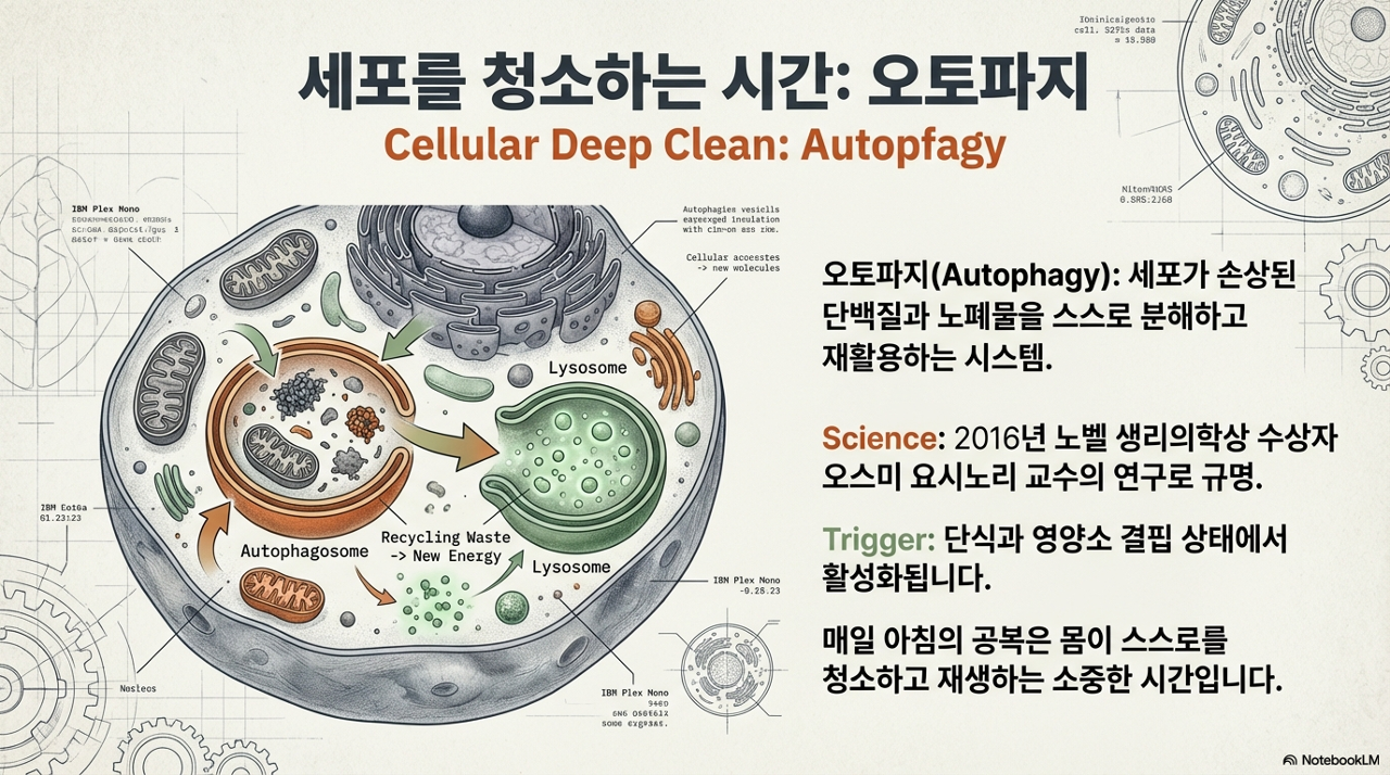 오토파지(autophagy)의 활성화. 세포가 손상된 단백질과 노폐물을 스스로 분해하고 재활용하는 과정인 오토파지는, 노화와 질병의 핵심 방어 기전 중 하나다. 2016년 노벨 생리의학상을 수상한 오스미 요시노리(大隅良典) 교수의 연구로 주목받은 이 기전은, 단식과 영양소 결핍 상태에서 활성화되는 것으로 알려져 있다. 매일 아침의 공복 시간은 이 세포 청소 시스템을 정기적으로 가동하는 스위치가 된다.