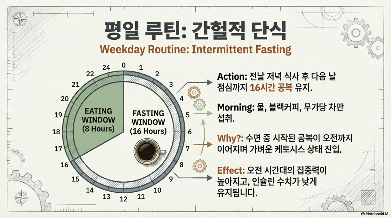 평일: 간헐적 단식으로 아침 케토시스 확보. 전날 저녁 식사 후 다음 날 점심까지 16시간 공복을 유지한다. 아침에는 물, 블랙커피, 무가당 차 정도만 마신다. 이것만으로도 오전 시간대에 가벼운 케토시스를 경험할 수 있고, 많은 사람들이 이 시간대에 집중력이 높아지는 것을 체감한다. 점심과 저녁은 평소대로 균형 잡힌 식사를 한다. 다만 정제 탄수화물과 첨가당을 줄이는 쪽으로 식단의 질을 개선하면 효과가 배가된다.